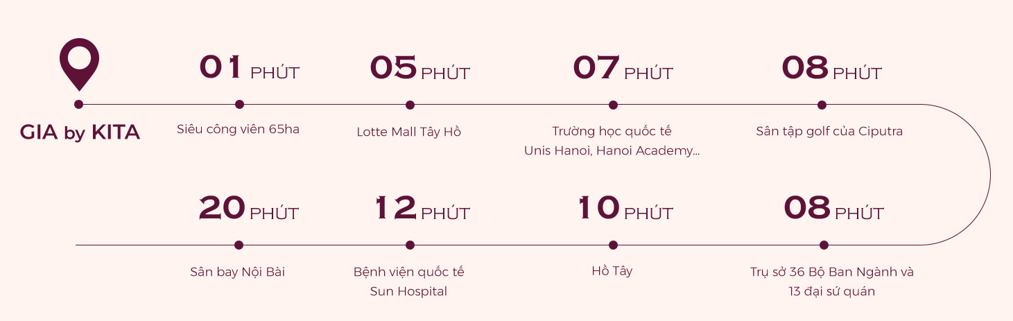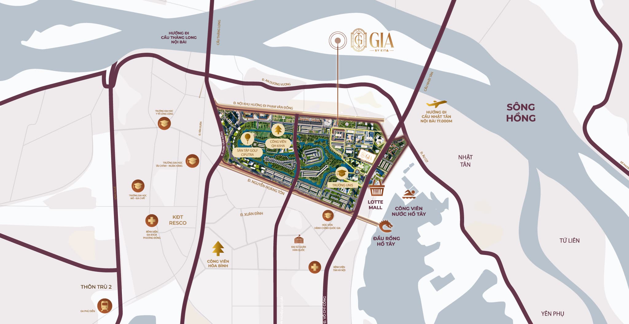 Dự án GIA By Kita tọa lạc tại vị trí chiến lược, tiếp giáp trực tiếp với các tuyến đường huyết mạch như Võ Chí Công, Nguyễn Văn Huyên, trục Nhật Tân – Nội Bài kết nối thẳng sân bay Nội Bài,… GIA by KITA với liên kết vùng hưởng trọn lực kéo giao thương mạnh mẽ từ các tập đoàn kinh tế tỷ USD: Tổ hợp R&D lớn nhất Đông Nam Á của Samsung, khách sạn Sun Ascott, khách sạn 6 sao Shilla Starlake, Daewoo Hàn Quốc… đồng thời tiếp cận trung tâm hành chính mới của Thủ đô với trụ sở 36 bộ, ban, ngành và 13 đại sứ quán.